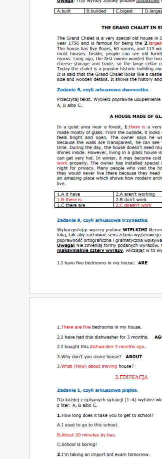 A LA ARKUSZOWO – ten materiał to 14 „a la” arkuszy egzaminacyjnych. Każdy z nich został mocno osadzony w słownictwie danego działu, dzięki czemu wszystkie zadania koncentrują się na utrwalaniu i sprawdzaniu znajomości wyrażeń z konkretnego zakresu leksykalnego. Tytuł zawiera „a la” tylko dlatego, że nie ma tu słuchania i pisania, ale reszta, to zadania 5-13,czyli dokładne odzwierciedlenie arkusza egzaminacyjnego.