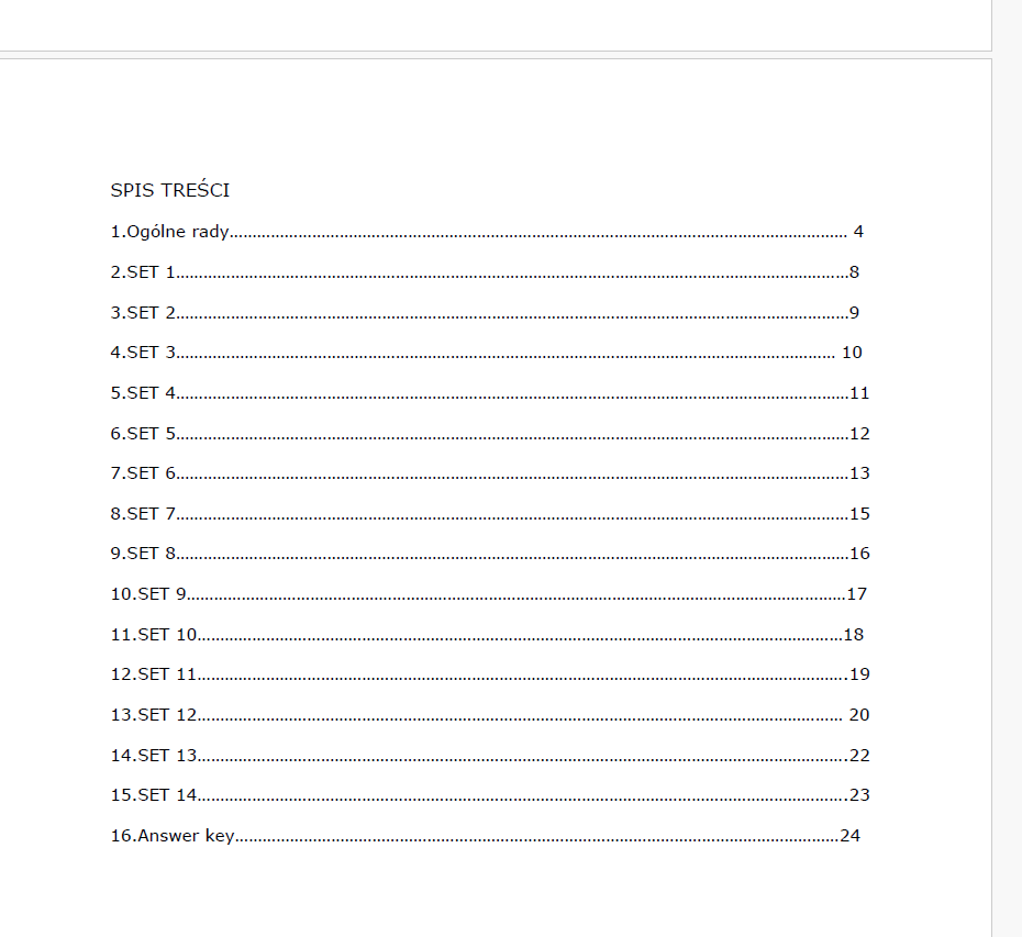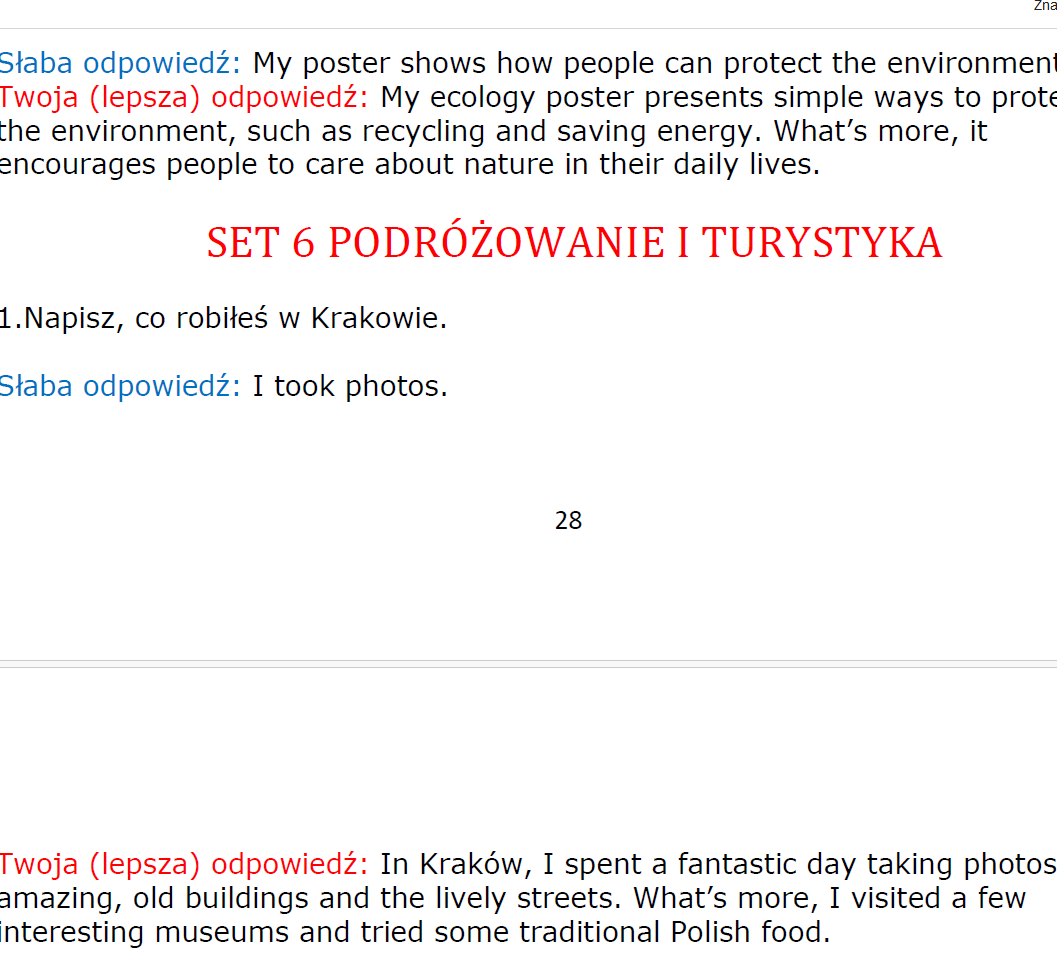 Materiał został podzielony na 14 zestawów tematycznych, każdy zawiera 5 zadań z prostymi przykładami odpowiedzi oraz ich ulepszonymi wersjami. Dzięki temu możesz ćwiczyć codzienne sytuacje, opisywać ludzi, miejsca, emocje, wydarzenia czy problemy w ciekawszy sposób, a jednocześnie rozwijać słownictwo i umiejętność tworzenia bardziej rozbudowanych zdań.