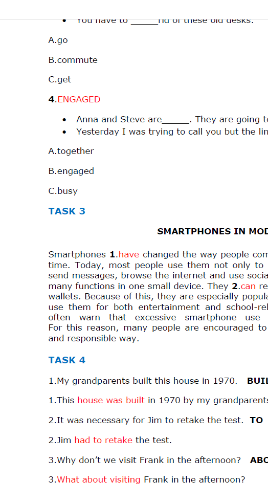 • TASK 3 – uzupełnianie krótkiego tekstu, czyli luki (wstawianie wyrazu lub przekształcanie już podanego)
