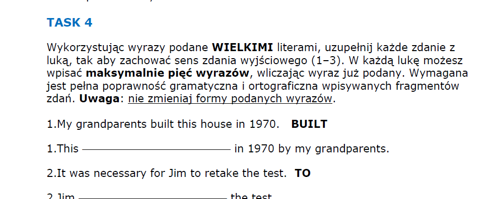 • TASK 3 – transformacje zdań lub tłumaczenia fragmentów zdań