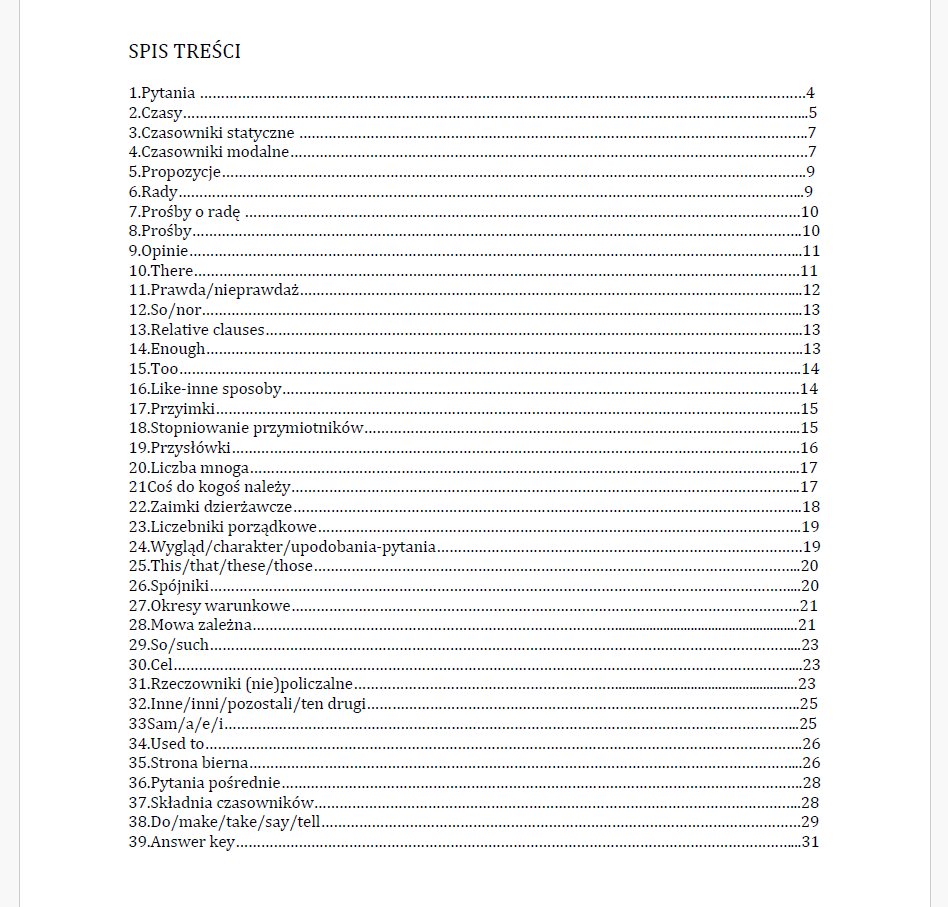 (NIE)ZWYKŁA GRAMATYKA”-MATURA POZIOM PODSTAWOWY- to wyjątkowy przewodnik, który w przystępny i praktyczny sposób przedstawia najważniejsze zagadnienia gramatyczne języka angielskiego. Materiał nie jest podany w typowo” książkowo-encyklopedyczny” sposób – zamiast tego wszystkie reguły zostały wyjaśnione jasno i zrozumiale, tak aby uczniowie mogli je łatwo przyswoić i zastosować w praktyce. Skupiłam się na konkretnych strukturach i zasadach gramatycznych (zgodnych ze spisem treści), ale nie jest to typowy zbiór ćwiczeń, ebook zawiera jedynie kilka starannie dobranych przykładów , które pozwalają uczniowi sprawdzić swoje rozumienie i utrwalić wiedzę w prosty sposób. Polecam go zarówno maturzystom przygotowującym się do egzaminu na poziomie podstawowym, jak i uczniom rozpoczynającym naukę w szkole średniej, którzy chcą zbudować solidne podstawy gramatyczne bez zbędnego komplikowania materiału. Jeśli szukasz podręcznika, który wreszcie wytłumaczy Ci gramatykę angielską jasno, bez nudnych regułek i zagmatwanych opisów, to ten ebook jest właśnie dla Ciebie.