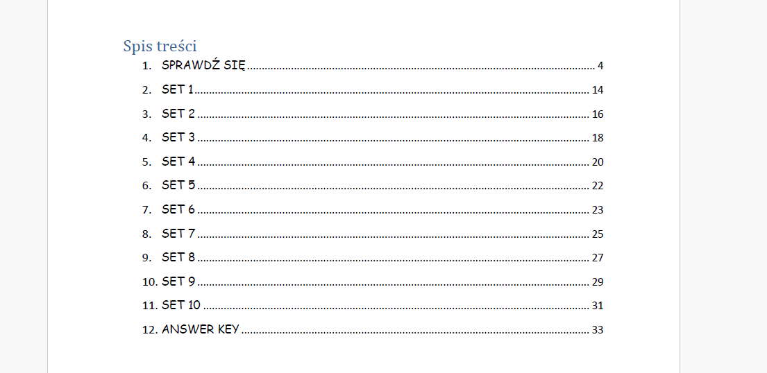 10 setów -każdy obejmuje 4 zadania typu: słowotwórstwo, sety leksykalne, tłumaczenie fragmentów, uzupełnianie luk (2 rodzaje) , transformacje ze słowem kluczem, test wyboru i answer key.