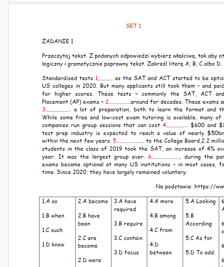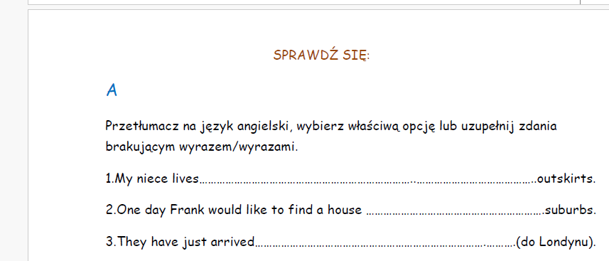 A:Przetłumacz na język angielski, wybierz właściwą opcję lub uzupełnij zdania brakującym wyrazem/wyrazami (50 zdń)