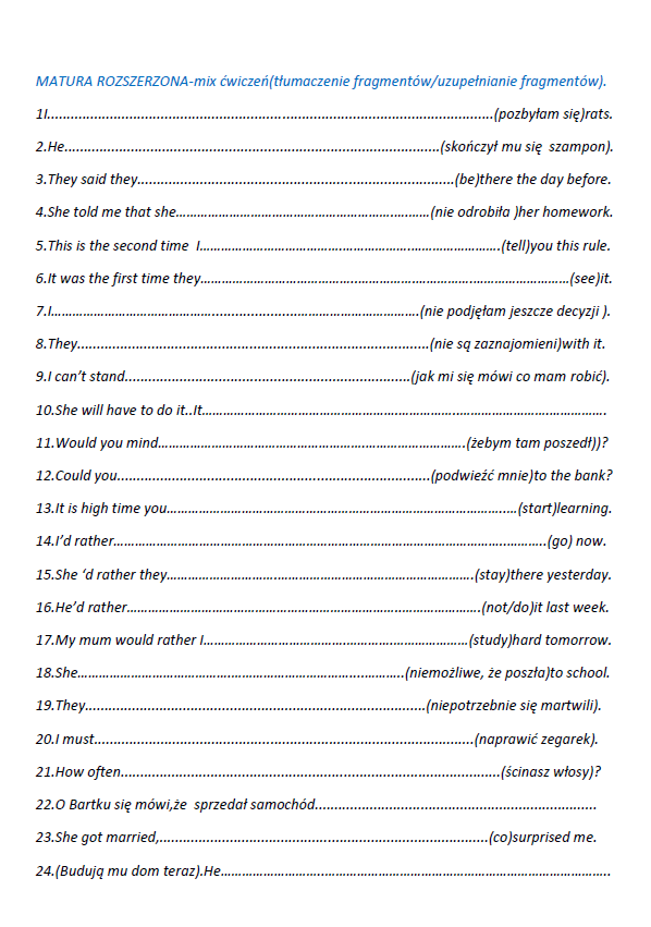 MATURA ROZSZERZONA-mix ćwiczeń(tłumaczenie fragmentów/uzupełnianie fragmentów)-150 zdań.