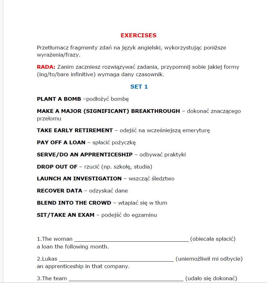 VERB PATTERNS-(NIE) TYLKO Z ARKUSZY-TŁUMACZENIE FRAGMENTÓW ZDAŃ